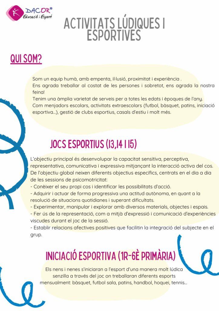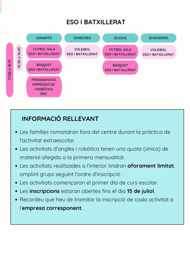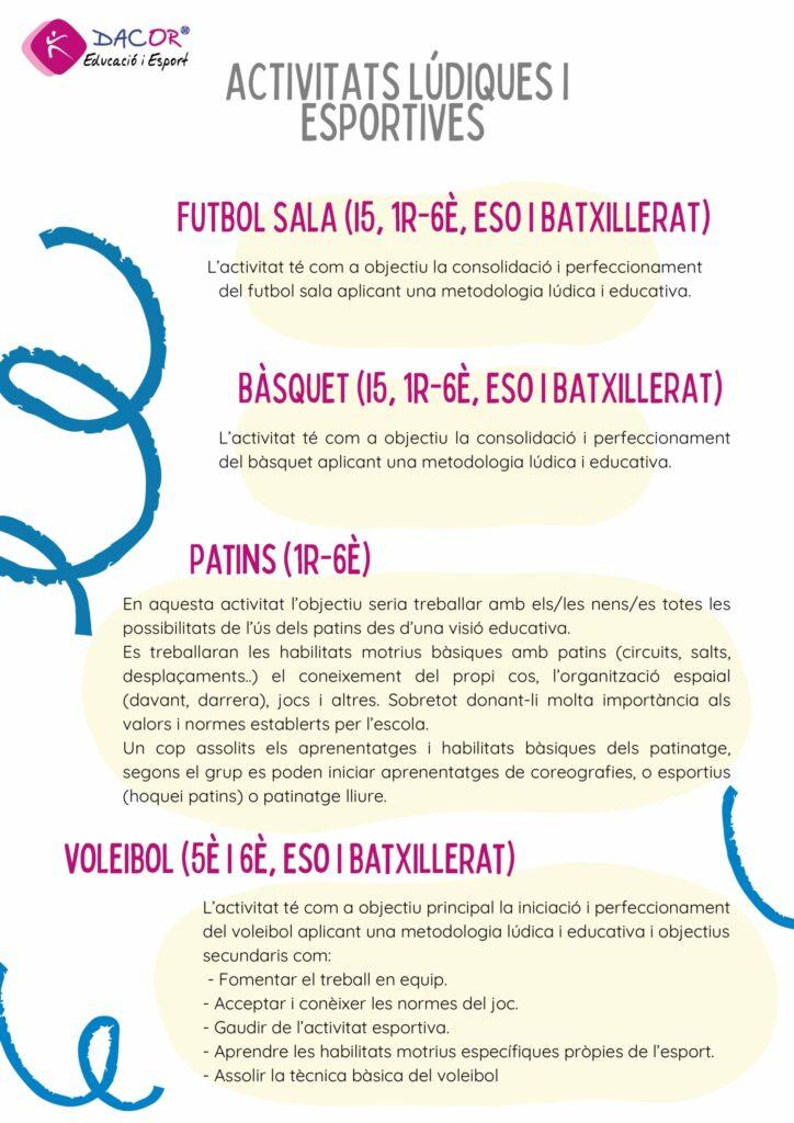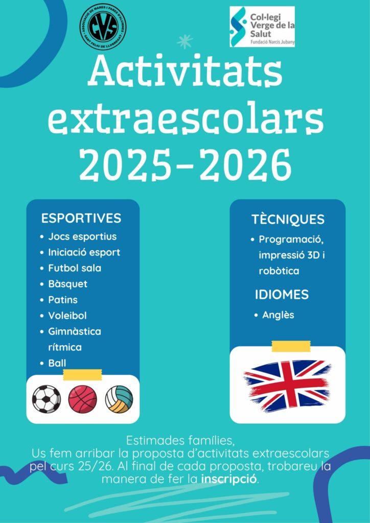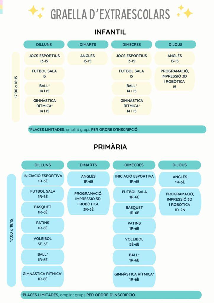 A l’escola oferim diferents activitats extraescolars que ajuden als nens i nenes a  descobrir, mitjançant el joc i l’esport, els valors i coneixements de l’oci. Gràcies a les extraescolars, els alumnes es relacionen i desenvolupen activitats que contribueixen a valorar el seu temps les relacions socials en un entorn lliure i cultural.